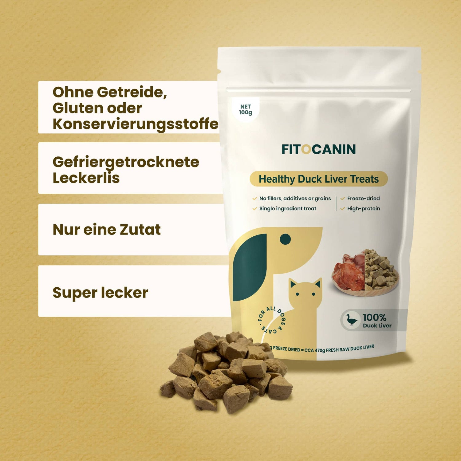 Wir sind überzeugt, dass dein Hund oder deine Katze die Fitocanin Enten-Leckerlis lieben wird. Falls nicht, bekommst du dein Geld zurück. Ohne Wenn und Aber.
