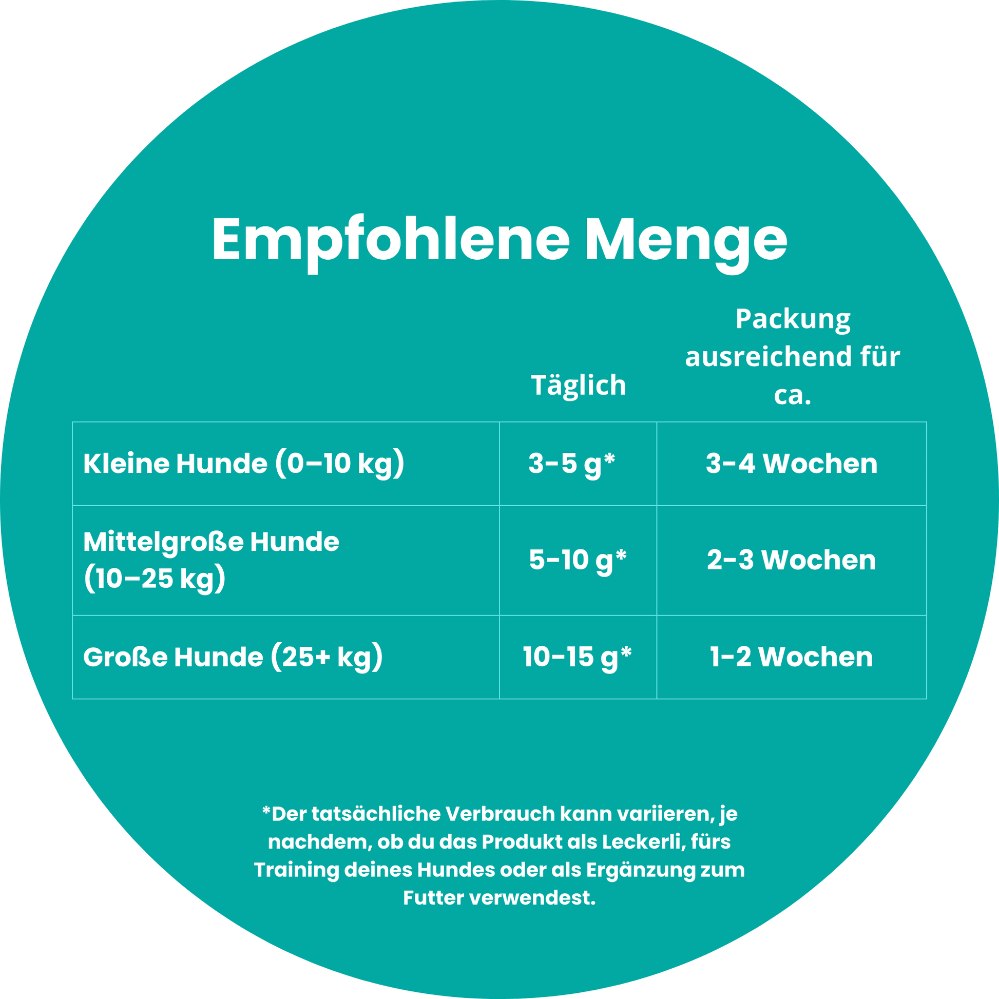 Fütterungsempfehlung: (1-10kg = 3-5g) / (10-25kg = 5-10g) / (25kg+ = 10-15g).