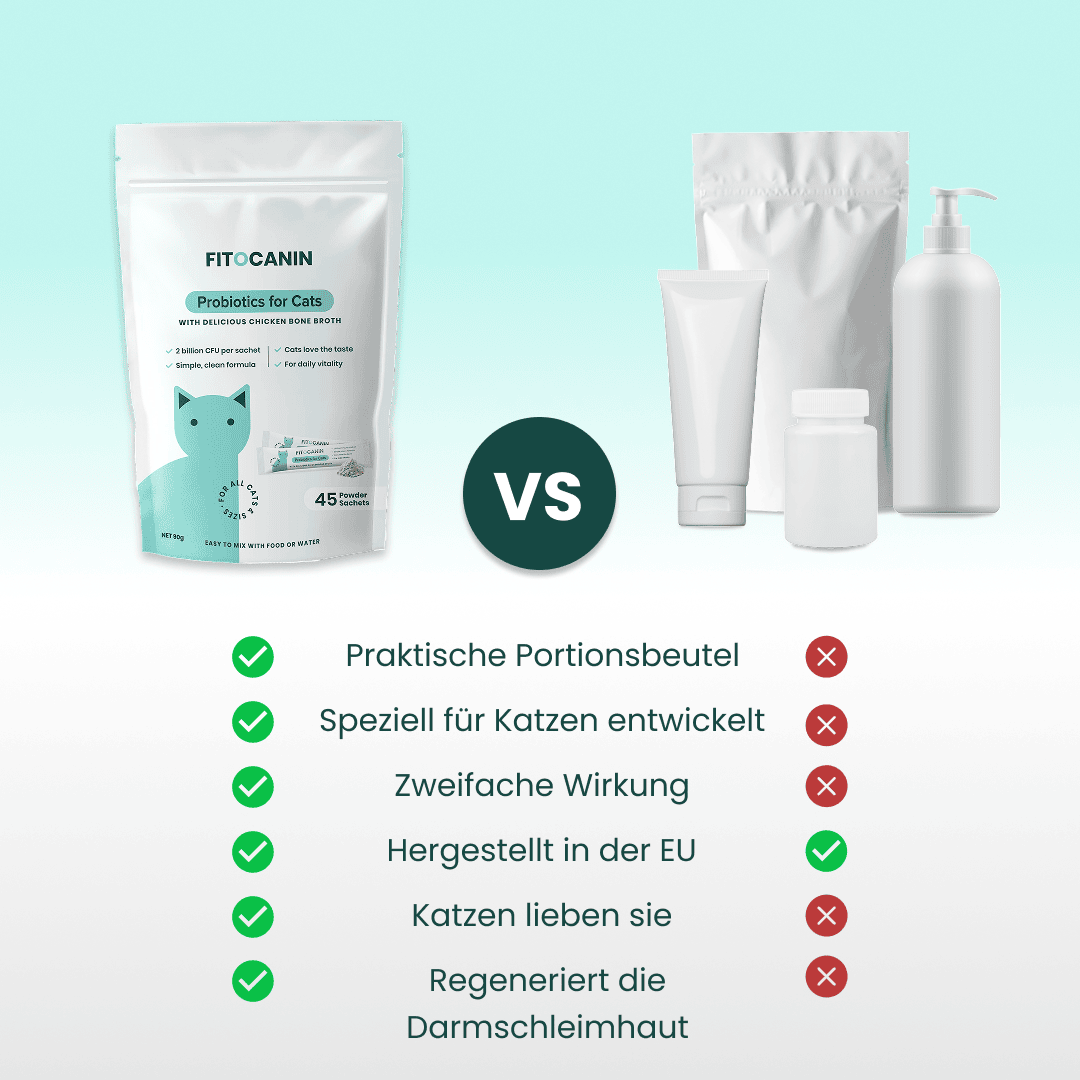 Die meisten Probiotika für Katzen fügen lediglich gute Bakterien hinzu, doch ohne eine gesunde Darmschleimhaut können sich diese Bakterien nicht richtig ansiedeln oder effektiv wirken.