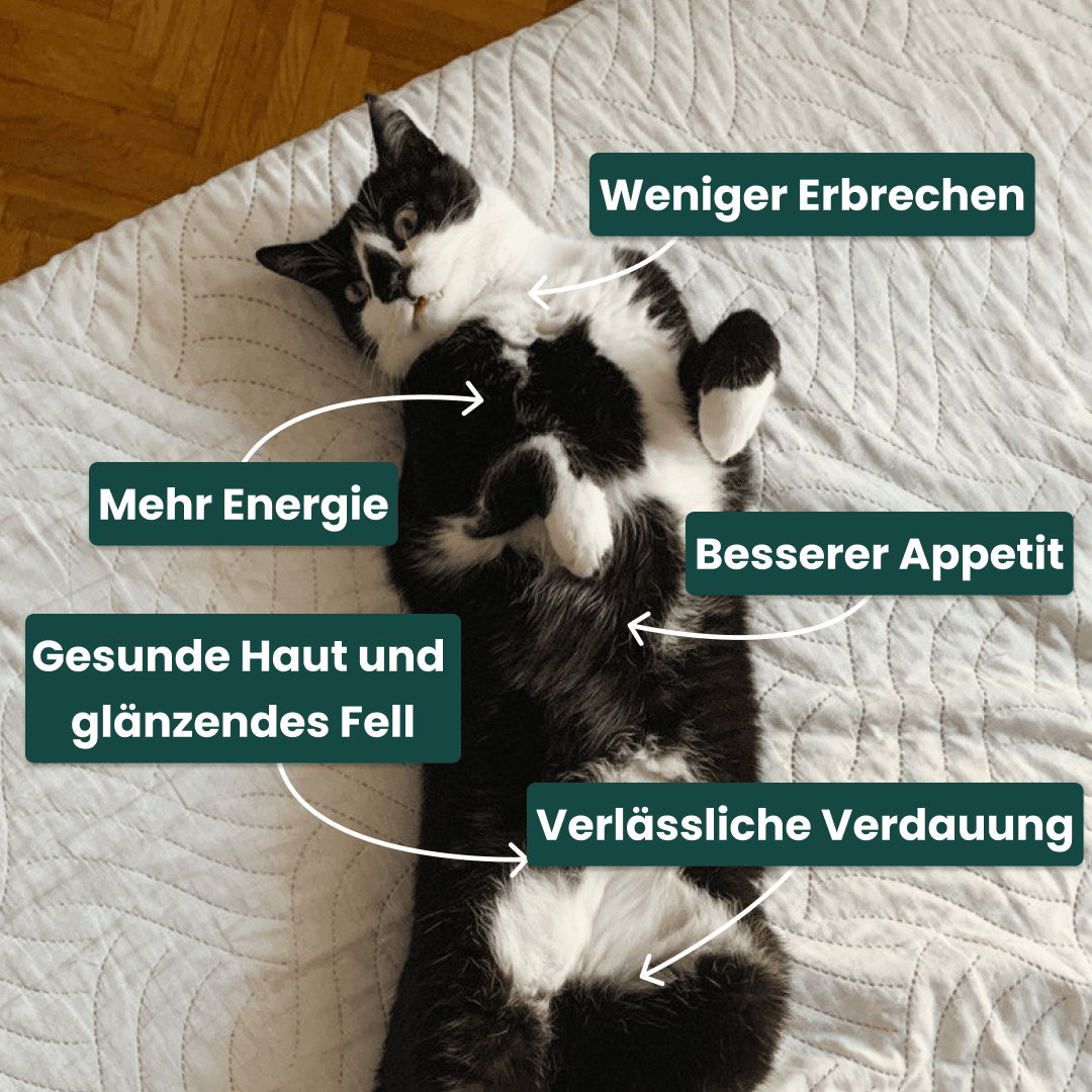 Die Katzen sind energiegeladener und die Verdauung bleibt auch bei Veränderungen stabil. Das Fell bleibt gesund und Halter bemerken ein ausgeglicheneres Verhalten, eine bessere Stressresistenz und mehr Vitalität.
